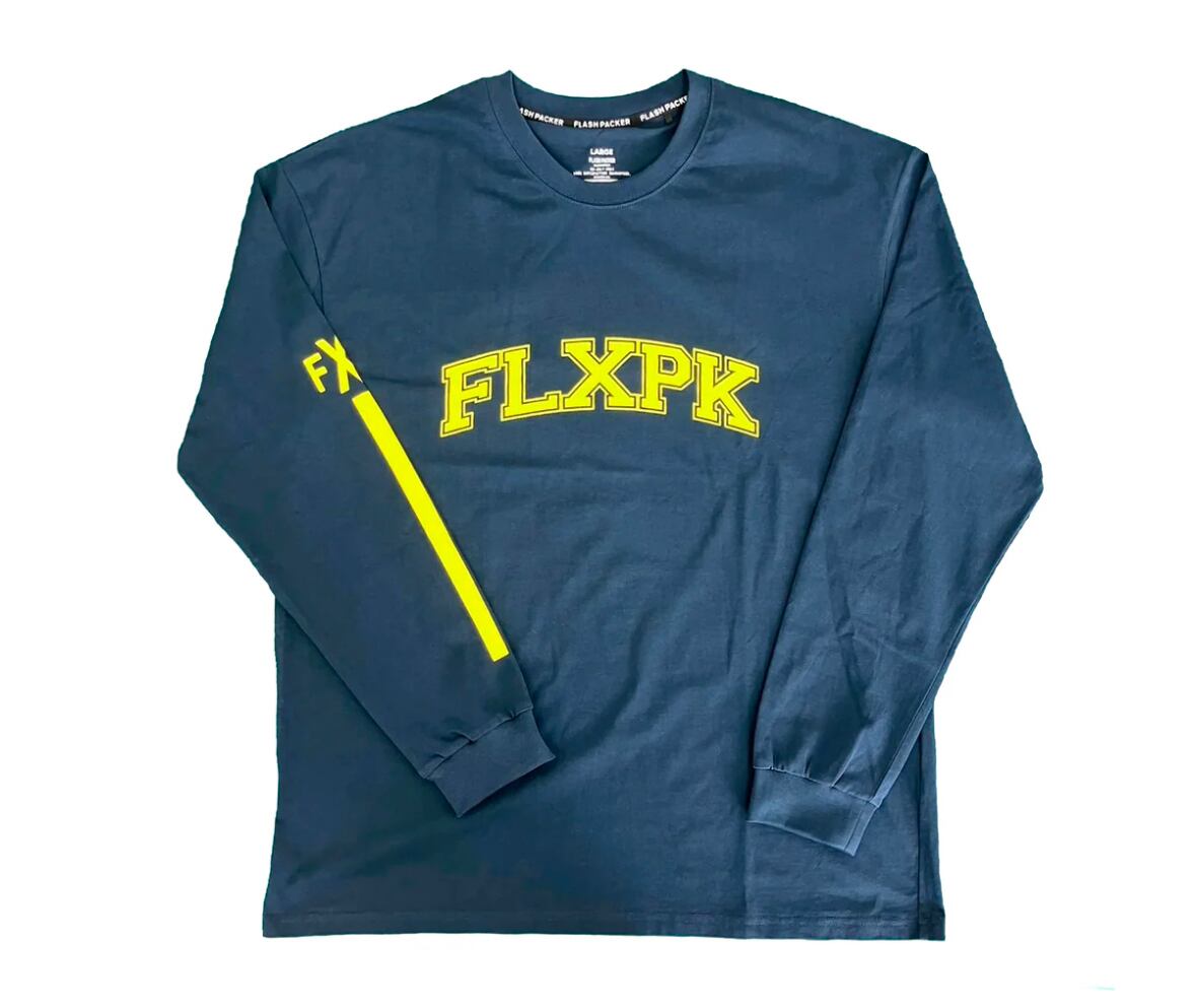 定番のカレッジロゴデザインですが、FLXPKロゴを絶妙なバランスでアーチ状に配置。始まりと終わりを完全に対象にすることでFLASH PACKERのこだわりを表現しています。 腕のラインプリントもポイントの、着こなしやすい一枚です。