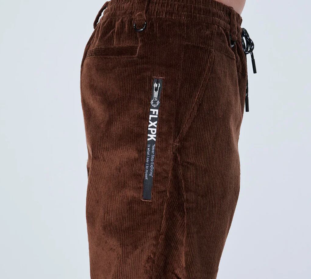 FXP定番のイージーパンツ仕様のシルエットをややチューンナップし、股上をやや浅く、レングスをやや長くしました。右サイドにロゴ入りファスナーポケットがつきます。